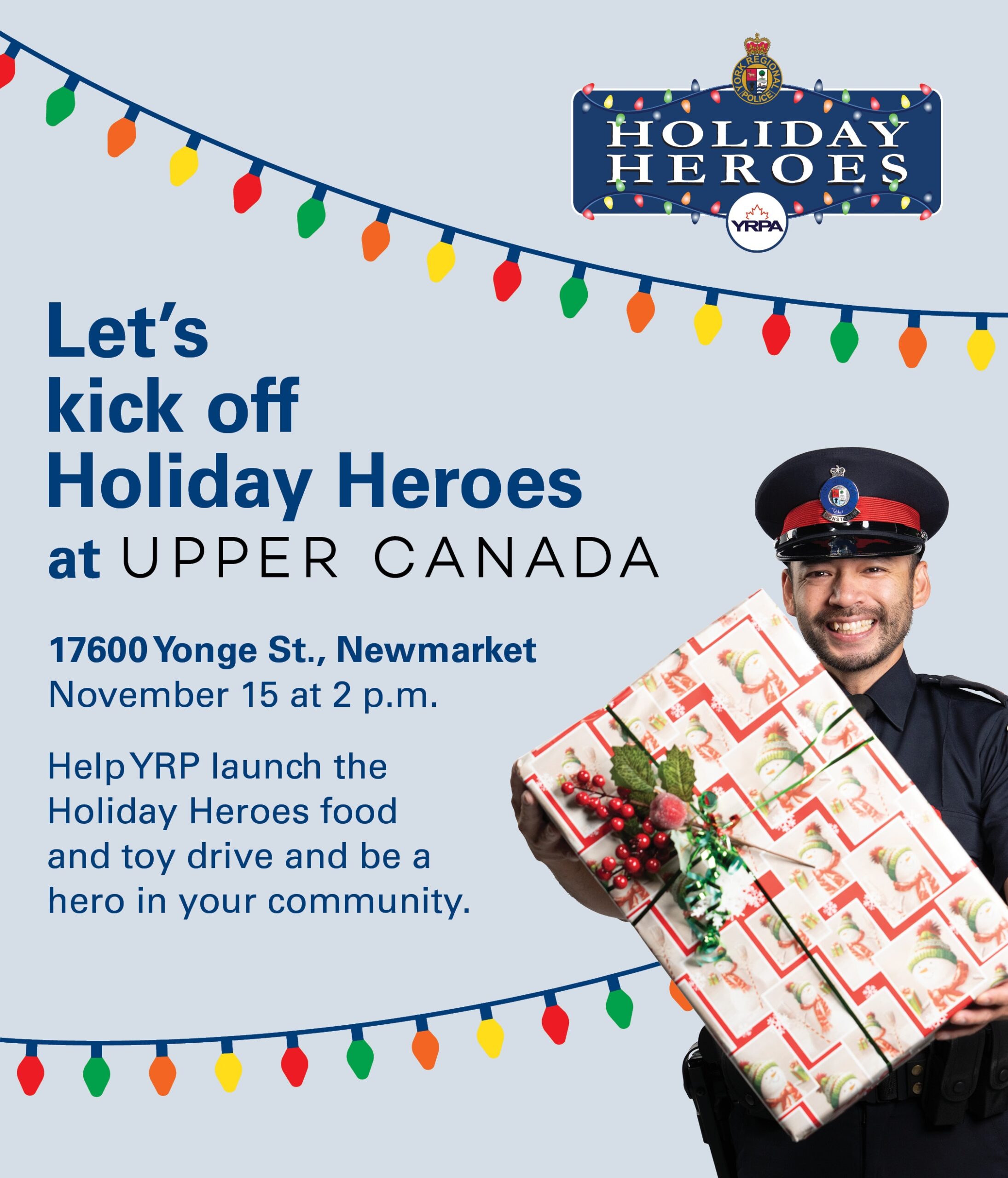 Let’s kick off Holiday Heros at Upper Canada! Help YRP launch the Holiday Heros food and toy drive and be a hero in your community.