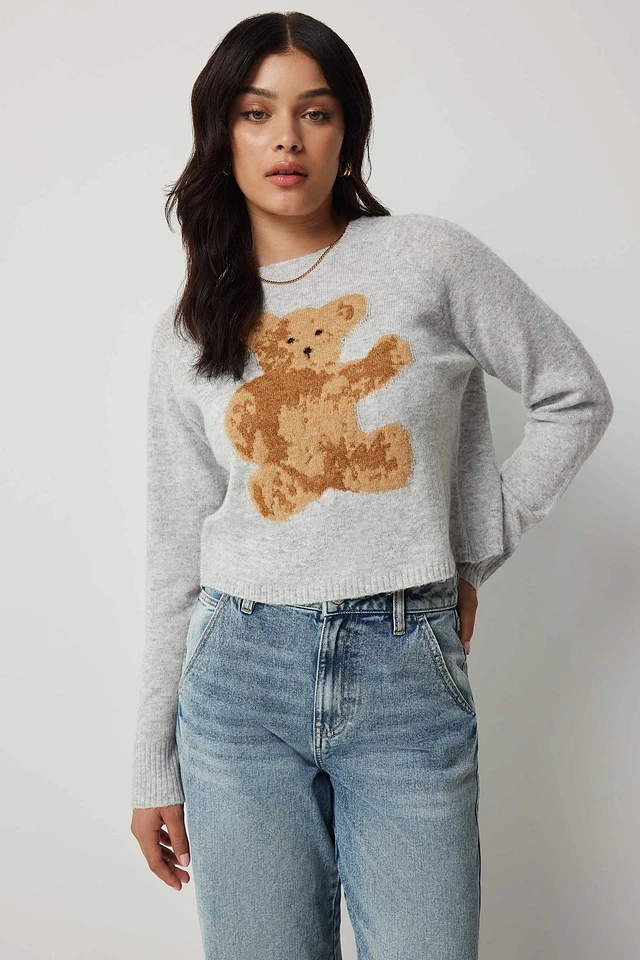Ardene Teddy Bear Raglan Sweater in Light Grey | Size | Polyester/Nylon/Viscose