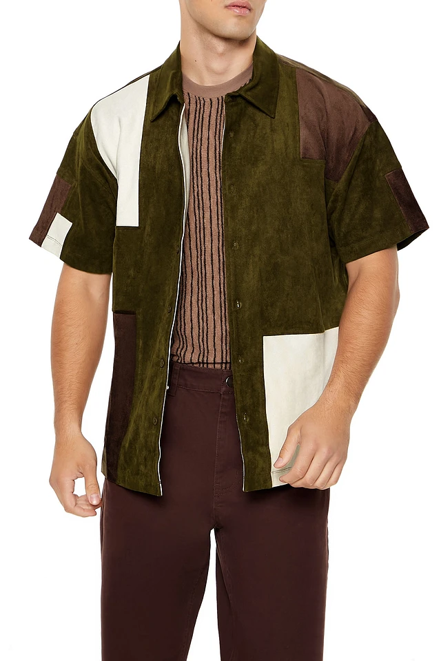 Faux Suede Colourblock Button-Up Top