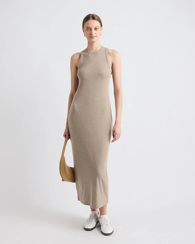 Sleeveless Crew-Neck Ribbed Midi Dress with Buttoned Placket